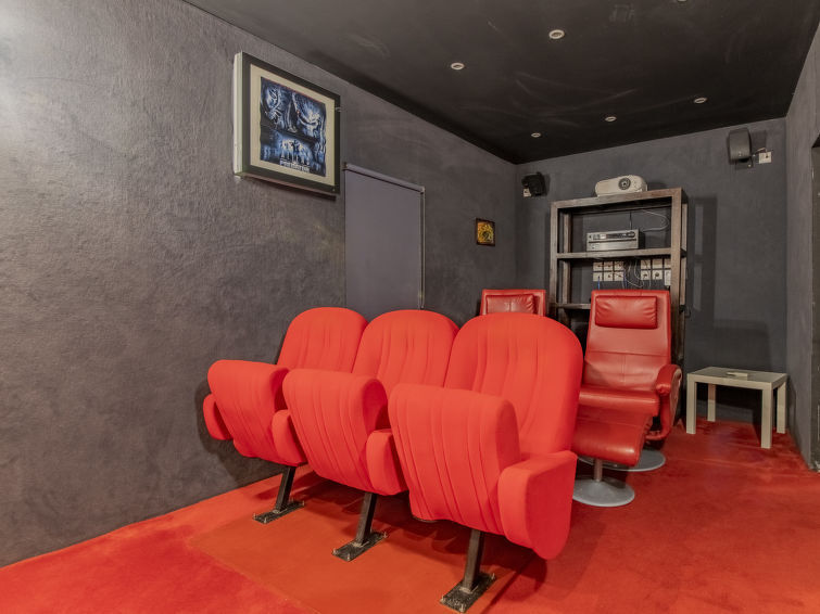 7-Zimmer-Haus 250 m2. Wohn-/Esszimmer mit TV (Flachbildschirm), Klimaanlage. Ausgang zur Terrasse. Billardzimmer. Offene Küche (4 Kochplatten, Backofen, Geschirrspüler, Mikrowelle, Tiefkühler, elektrische Kaffeemaschine, Kapseln für die Kaffeemaschine (Nespresso) extra). Sep. WC. Heizung. Obergeschoss: 1 Zimmer mit 1 franz. Bett (140 cm, Länge 190 cm), Klimaanlage. 2 Zimmer, jedes Zimmer mit 1 franz. Bett (140 cm, Länge 190 cm). 1 Zimmer mit begehbarem Kleiderschrank mit 1 franz. Bett (180 cm), Dusche/WC und TV (Flachbildschirm), Klimaanlage. Dusche, sep. WC, Doppelwaschbecken. Terrasse 200 m2 teilweise überdacht. Terrassenmöbel, Gartengrill, Liegestühle. Zur Verfügung: Waschmaschine, Bügeleisen. Internet (Wireless LAN, gratis). Parkplatz (4 Autos). Bitte beachten: Rauchmelder. Kinosaal - Video im Mietpreis inbegriffen.