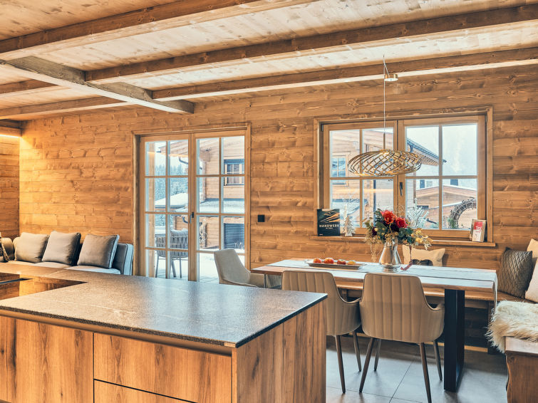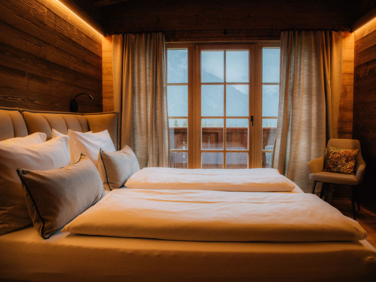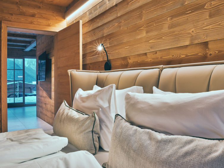"Sissis green Chalets", 16-Zimmer-Chalet. Luxuriös und mit viel Holz eingerichtet: Eingang. 4 Doppelzimmer, jedes Zimmer mit Dusche/WC, TV und Digital-TV (Flachbildschirm). Grosse Wohnküche (Geschirrspüler, 4 Induktionskochplatten, Toaster, Wasserkocher, Mikrowelle, elektrische Kaffeemaschine, Kochinsel) mit Esstisch, offenem Kamin, TV und Digital-TV (Flachbildschirm), elektrischem Rollladen. Ausgang zur Terrasse. Obergeschoss: 8 Doppelzimmer, jedes Zimmer mit Bad/Dusche/WC, TV und Digital-TV (Flachbildschirm). Ausgang zum Balkon. 4 grosse Terrassen 25 m2. Terrassenmöbel, Gartengrill, Liegestühle. Schöne Sicht auf die Berge. Zur Verfügung: Waschmaschine, Sauna, Haartrockner. Internet (WLAN, gratis). Parkplatz. Bitte beachten: Nichtraucher-Haus. Alle 4 Chalets als gesamte Einheit inklusive Multi-Media-Veranstaltungsraum in seperatem Gebäude.