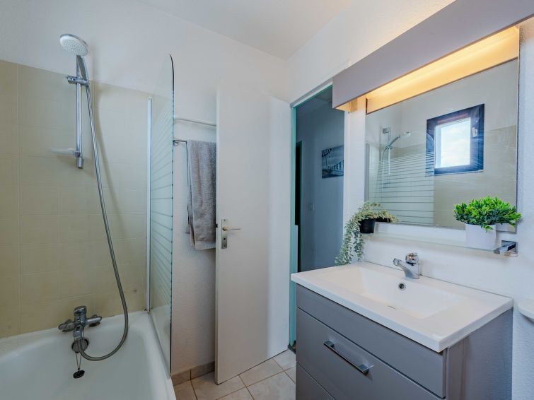 Appartement 3-kamers 44 m2 op de 3e verdieping, op het zuiden gelegen. Woon-/eetkamer met TV (Flatscreen TV). Uitgang naar het terras. 1 kamer met 1 2-pers bed (1 x 140 cm, lengte 190 cm). Open keuken (mini-oven, afwasmachine, magnetron, elektrische koffiemachine). Bad/WC. Bovenverdieping: 1 kamer met 1 x 2 stapelbedden (90 cm, lengte 190 cm). Terras 6 m2. Terrasmeubelen. Mooi uitzicht op het meer en de bergen. Ter beschikking: wasmachine. Internet (WiFi, extra). Rookmelders. Aanbod door een particulier volgens art. 155, IV van CGI.