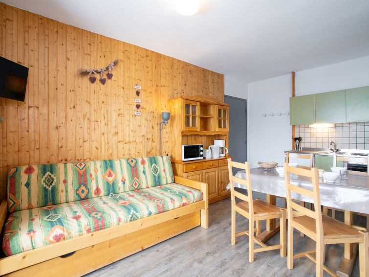 "Jettay Bruant 57", appartement 2-kamers 24 m2 op de 1e verdieping. Mooi ingericht: woon-/eetkamer met 1 uitschuifbaar bed (2 pers. 2 x 80 cm, lengte 190 cm), TV (Flatscreen TV). Uitgang naar het balkon. 1 kamer met schuifdeur met 1 divanbed (140 cm, lengte 190 cm). Kookhoek (4-pits kookplaat, oven, waterkoker, magnetron, elektrische koffiemachine). Badkamer, aparte WC. Elektrische verwarming. Balkon, op het westen gelegen. Mooi uitzicht op de bergen. Ter beschikking: Internet (WiFi, extra). Maximaal 1 huisdier/hond toegestaan. Rookmelders. Ingang Bruant.