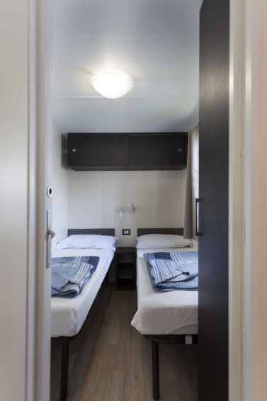 "Baia Relax New Plus", 3-kamers mobilhome 25 m2. Modern ingericht: woon-/eetkamer met eettafel en TV. 1 kamer met 1 2-pers bed (140 cm). 1 kamer met 2 bedden (70 cm), 1 x 1 stapelbedden (65 cm, lengte 170 cm). Kookhoek (4 kookpitten (vlammen), diepvriezer). Douche/WC. Air-conditioning, heteluchtverwarming. Terras overdekt. Terrasmeubelen. Ter beschikking: kinderbed tot 2 jaar (extra). Internet (Internet (WiFi), extra). Parkeerplaats (1 Auto). Niet rokers woning. Bedindeling is flexibel. Er zijn meer slaapmogelijkheden beschikbaar dan het maximaal toegestane aantal personen dat echter niet mag worden overschreden. IT023022B1P4KHX4L9
